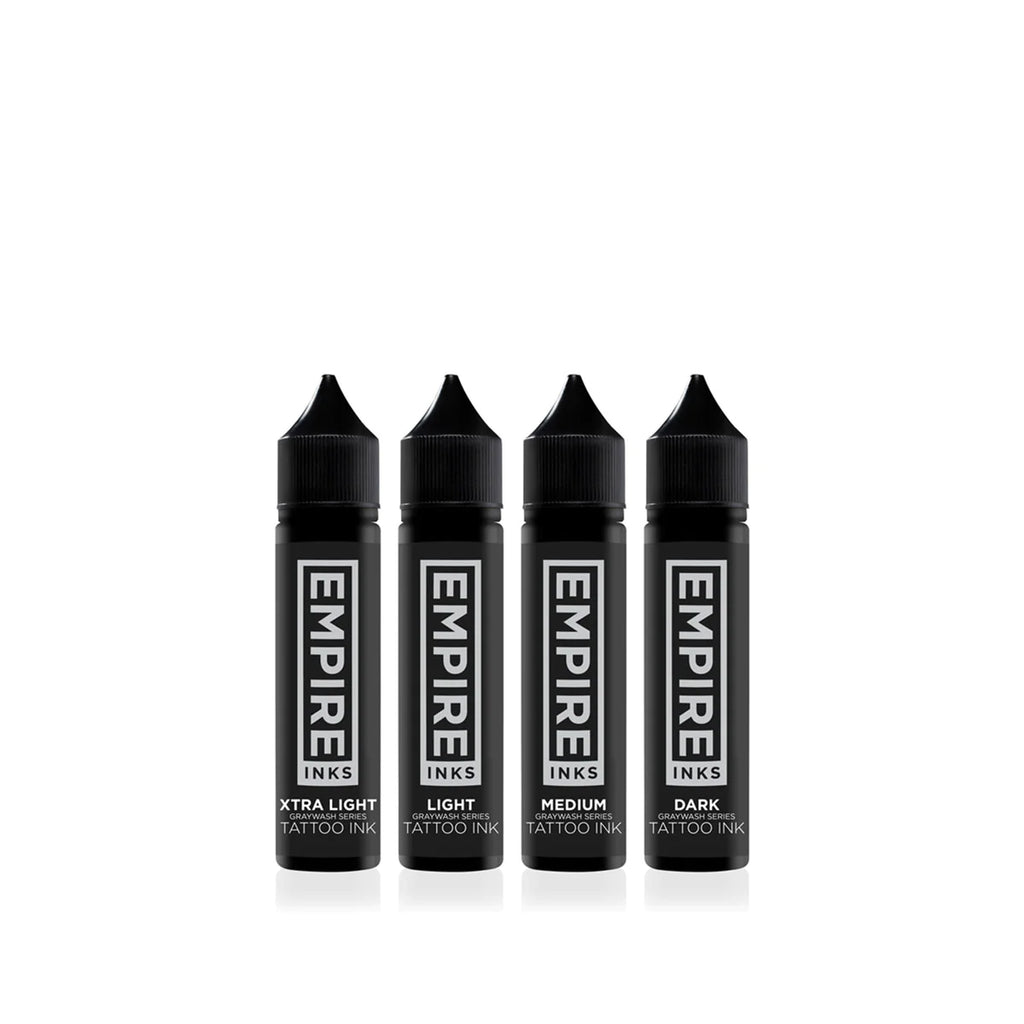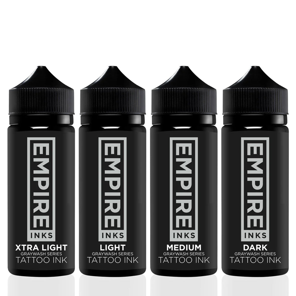 Tattoo artists worldwide have turned to using pre-mixed graywash. Larger batches offer undeniable consistency. Empire Inks heals beautifully in cool tones, causing stark contrast between warm skin tones and bluish grays of the inks.